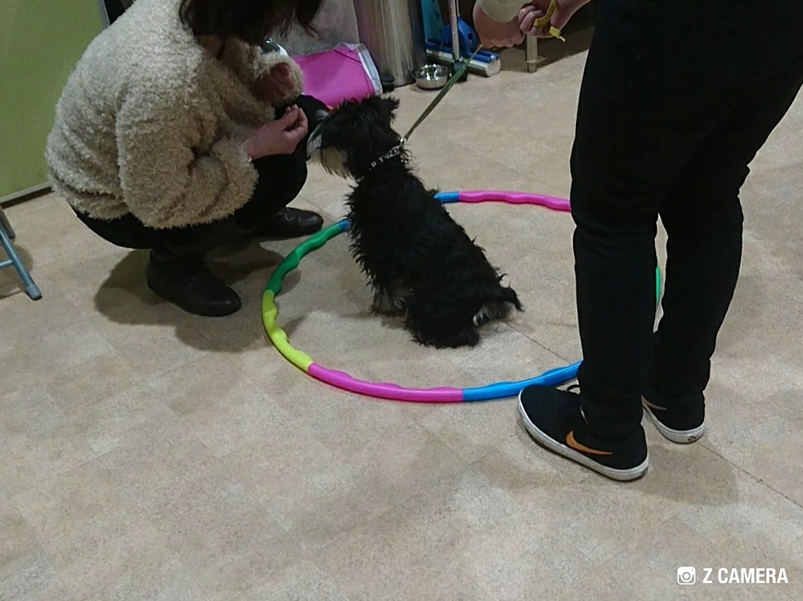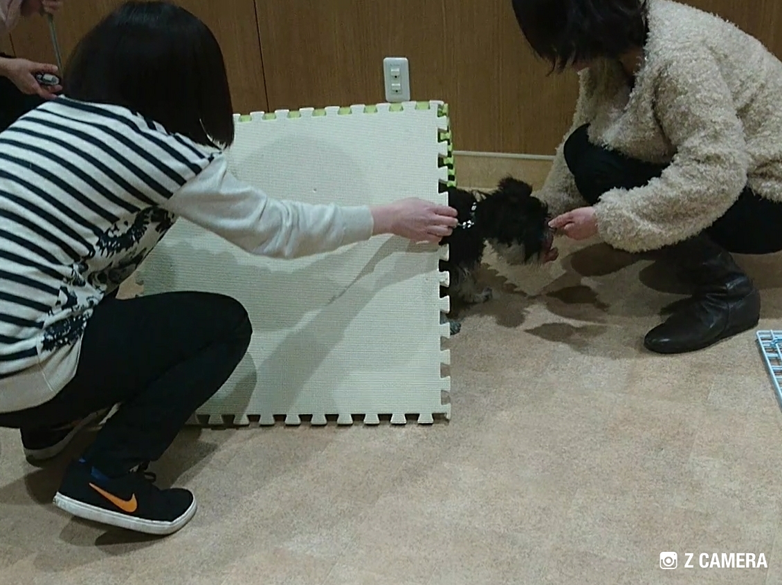 休憩の後は、ゲームタイムでアジリティをやりました。床に置いた金網の上を歩いたり、トンネルをくぐったりと、ワンちゃんが怖がる障害物をクリアして、最後床に置かれた輪っかの中でお座りをして飼い主さんと目が合ったら、ご褒美のおやつをあげるゲームで、ゴールまでのタイムを競います。